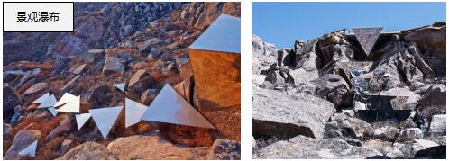 鏡面不銹鋼制成的倒三棱錐,錯落置于山坡上,椎體表面鋼板較薄產(chǎn)生形變,呈現(xiàn)出一種微妙的介于隱形與顯形之間的狀態(tài)。